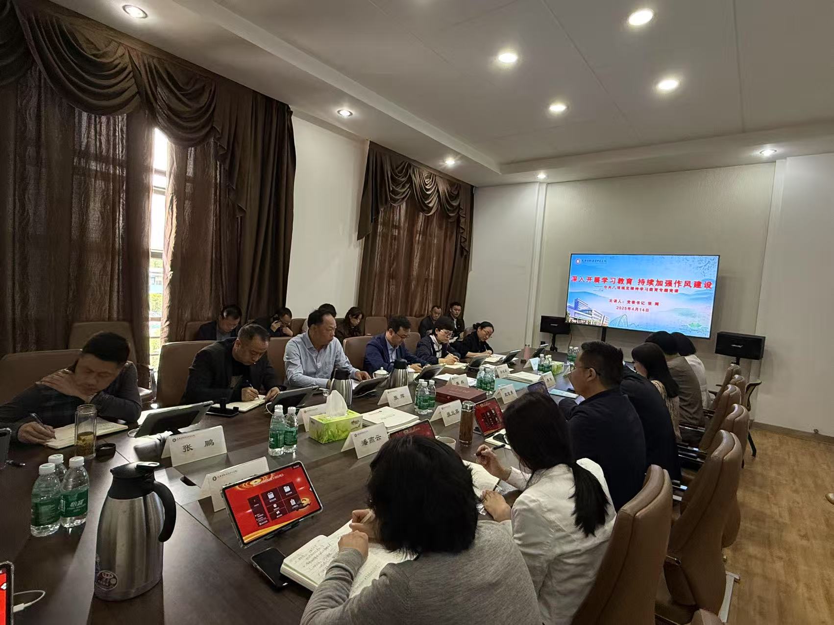 為進(jìn)一步深化黨風(fēng)廉政建設(shè),貫徹落實(shí)中央八項(xiàng)規(guī)定精神,強(qiáng)化黨員干部紀(jì)律意識(shí)和規(guī)矩意識(shí),2025年4月14日,新津區(qū)中醫(yī)醫(yī)院組織召開“深入開展學(xué)習(xí)教育、持續(xù)開展作風(fēng)建設(shè)”專題黨課學(xué)習(xí)會(huì)。黨委書記張輝同志主講,黨政班子成員、中層干部參會(huì)。