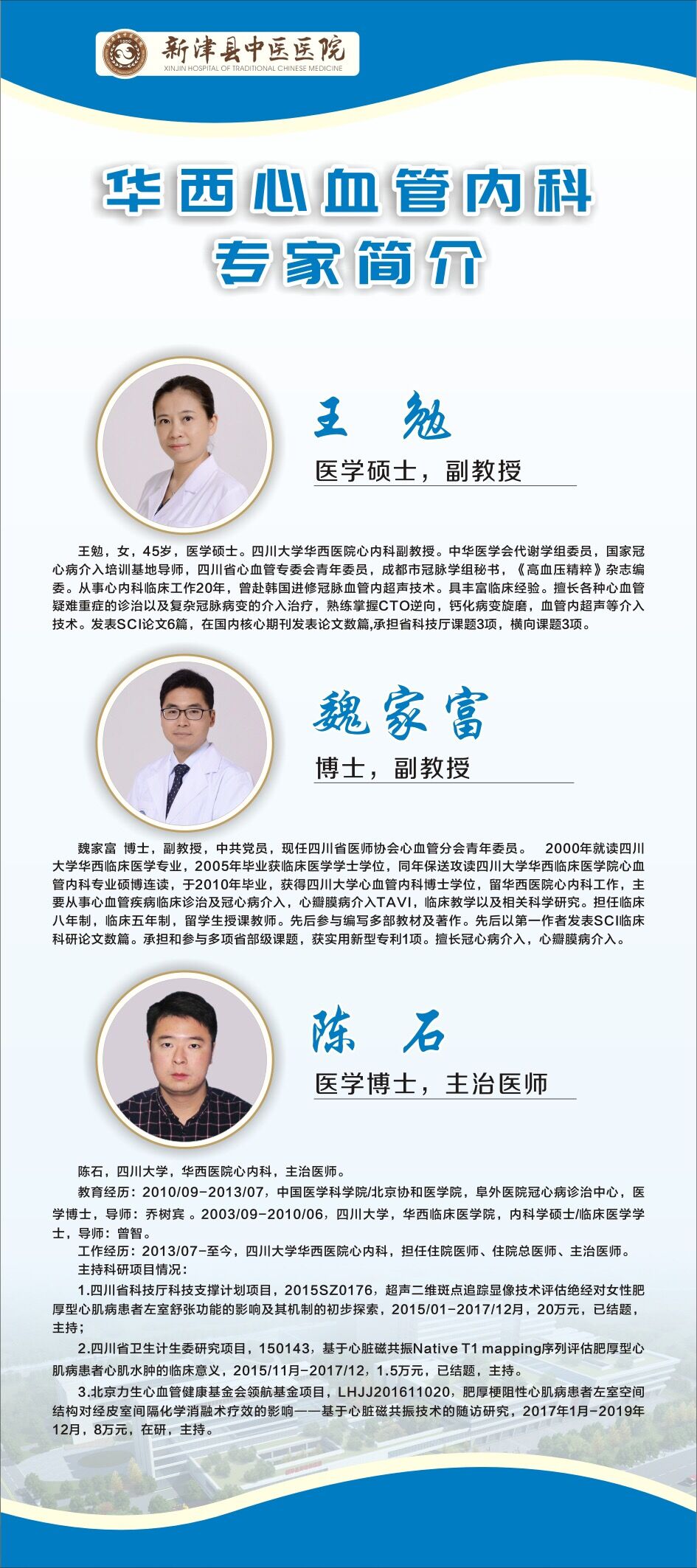 華西心血管內(nèi)科博士專家團(tuán)隊(duì)共三人,他們將于每周星期一上午在成都市新津區(qū)中醫(yī)醫(yī)院(新津區(qū)西創(chuàng)大道1389號(hào))輪流坐診,主治冠心病、高血壓病、風(fēng)心病、心力衰竭、心律失常等心血管內(nèi)科常見(jiàn)病及危急重癥。